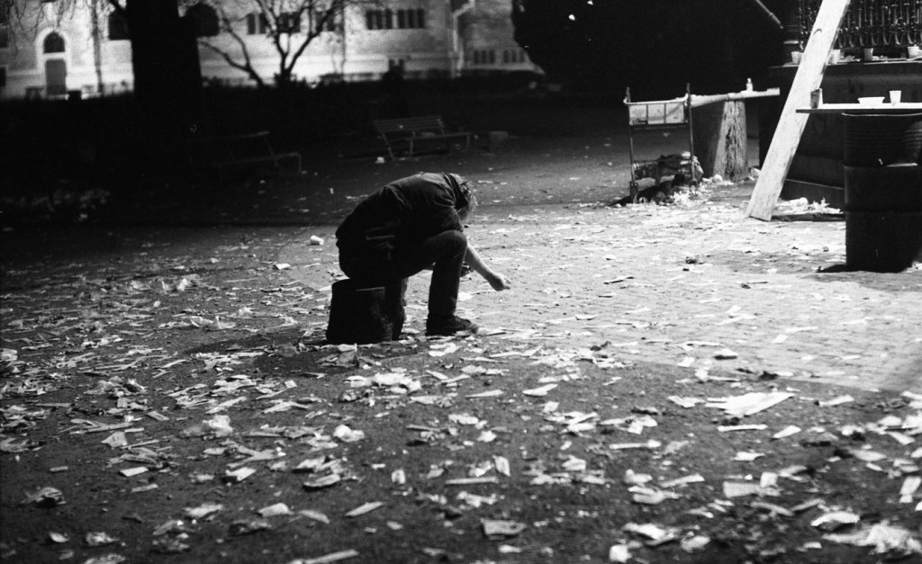 נרקומנית עומדת באמצע מעבר חצייה ברחוב סלומון ומביטה במראת צד של אוטו שהיא מחזיקה בגובה הפנים. מפנה אותה לימין, מפנה לשמאל. מתעלמת מתנועת הרכבים, ועסוקה מדי בצדודיתה כדי לראות שאיש זקן עצר בצד הדרך לצלם אותה. אבל אחרי רגע הוא נכנס לה לשדה הראייה ומיד היא פורצת, תוך כדי ריצה לעברו, במסכת קללות מסמרת שיער. היא מניפה את המראה כנשק, משליכה אבנים, וכהרף עין – ממשיכה בדרכה. ההמולה הסתיימה. ולצלמנו שלום.